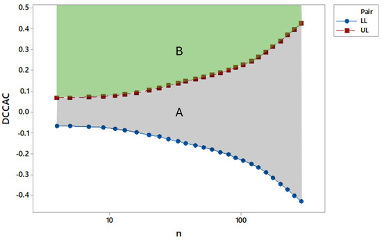 Another key aspect of the analysis is the presence of results falling within the non-significant cross-correlation area. Batteries with severely deteriorated SOH tend to have most of their computed DCCAC values within this non-significant range, inside the zone A, grey color, presented in Figure 2. This means that their voltage signals do not exhibit a meaningful correlation with a healthy reference battery, reinforcing the conclusion that the battery is no longer performing optimally. The ability to distinguish between significant and non-significant cross-correlation is crucial for establishing a clear threshold for battery failure detection.