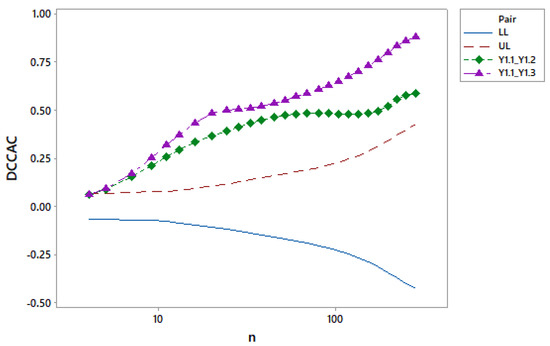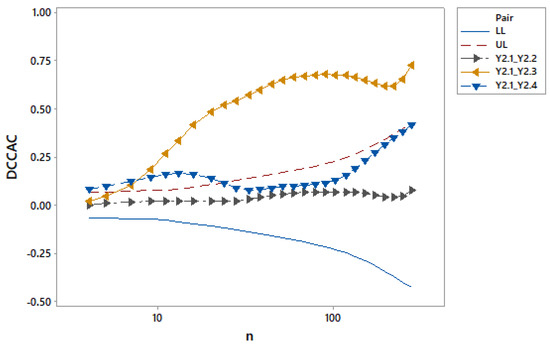Finally, the Detrended Cross-Correlation Analysis Coefficient (DCCAC) is determined using Equation (4). The DCCAC normalizes the covariance function by the individual detrended fluctuation functions and , which represent the auto-affinity of each time series.