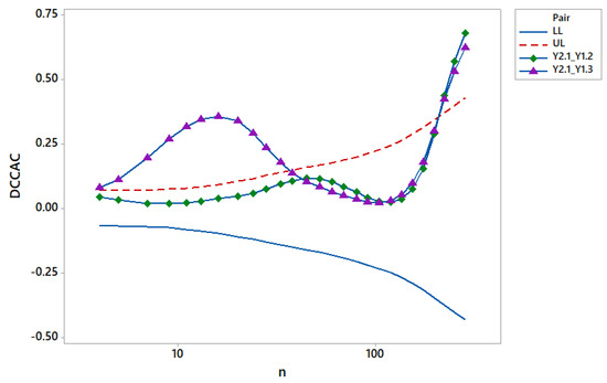 Finally, it was verified that the method cannot be applied to compare different engine displacements using a unique baseline engine as a reference. Figure 5 evaluates the pairs Y2.1,Y1.2 and Y2.1,Y1.3 against the 95% confidence intervals. Vehicle Y2.1, with a 2.0-L engine, serves as the baseline for this analysis, while Y1.2 and Y1.3 are 1.5 L engine vehicles with batteries in good SOH. Initially, DCCAC values for the pair Y2.1,Y1.2 are not statistically significant, as they fall between the UL and LL for almost all boxsizes. As the boxsize increases (), DCCAC values exceed the UL, indicating statistically significant positive cross-correlation. For the pair Y2.1,Y1.3, DCCAC values are significant for smaller box sizes (), but become statistically insignificant afterward, almost mimicking the other analyzed pair for the remaining box sizes. However, unlike the rising curves observed in Figure 3, Figure 5 presents a break in the constant rising pattern, indicating that DCCAC comparisons between different engine displacements may be unfeasible.