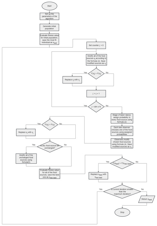 Artificial Bee Colony (ABC) is an optimization metaheuristic algorithm, one of many inspired by the behaviors observed within the animal kingdom. One of the first publications presenting this algorithm is [16]. This algorithm has been applied in the optimization of various processes, for example [17,18,19,20,21].