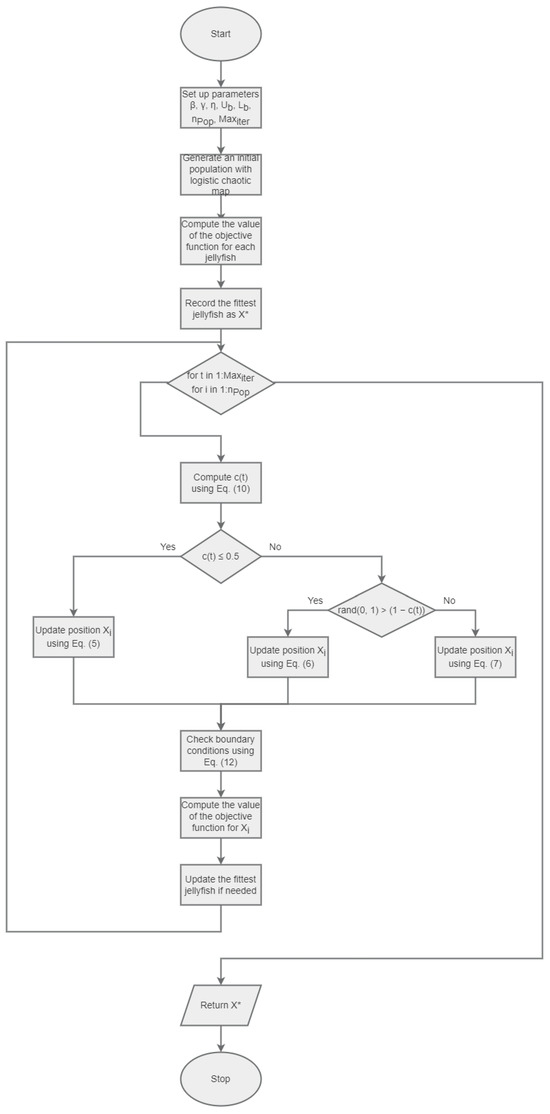 Jellyfish search uses the logistic map, rather than random positions for the initialization of the population. That is to ensure better diversion and minimize the risk of converging prematurely.