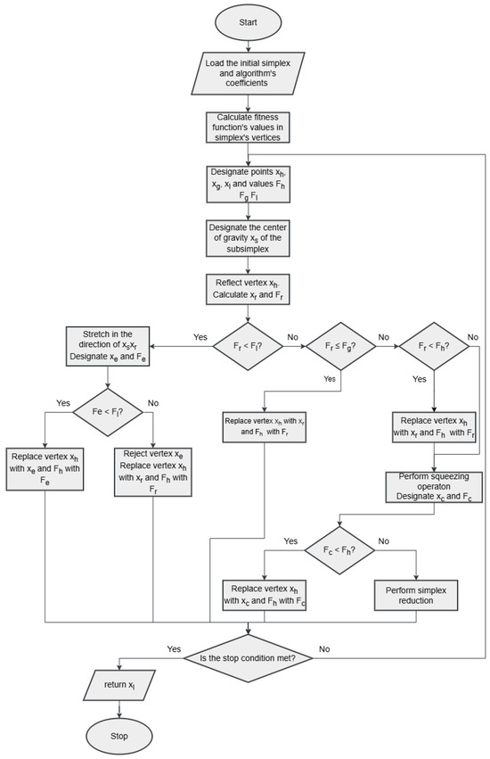 where —the reflection coefficient, —the stretching coefficient, —the squeezing coefficient. These coefficients can be adjusted for specific tasks. Based on experimentation, the authors of the method suggested the following values: , , and . These values were used in the tests conducted for this paper. The algorithm operates until the following condition is met: