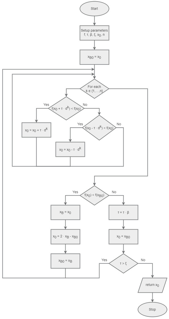 The Hooke-Jeeves method (also known as “direct search”) is an algorithm used to find the minimal values of functions in a deterministic manner. It was proposed by Robert Hooke and T. A. Jeeves in 1961; however, an early version of this algorithm has been attributed to Enrico Fermi. More information about the algorithm, its modifications, and applications can be found in [29,30,31,32].