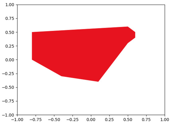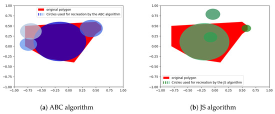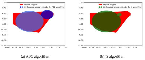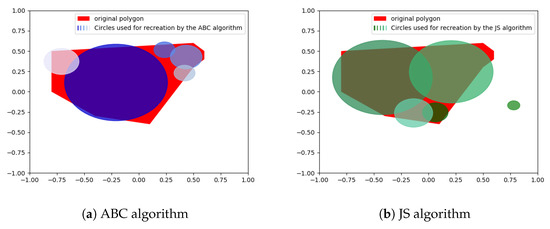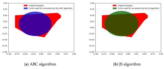In this example, two metaheuristic algorithms were compared, namely Artificial Bee Colony (ABC) and Jellyfish Search (JS). During the first stage of testing, the population and number of iterations of the ABC optimization algorithm were set to twenty. Iterations and population of the JS optimization algorithm were set differently for each number of circles, in a way that would ensure a similar time of evaluation that both algorithms would need to complete the task. The task was to reconstruct (or identify) a polygon (see Figure 5) using circles, ranging from one to five. The energy absorption value for the polygon was equal to one. Figure 6, Figure 7, Figure 8, Figure 9, Figure 10, Figure 11, Figure 12, Figure 13, Figure 14, Figure 15, Figure 16, Figure 17, Figure 18, Figure 19 and Figure 20 present the obtained results for Example 1. A detailed discussion of the results is provided in Section 5 (Discussion).