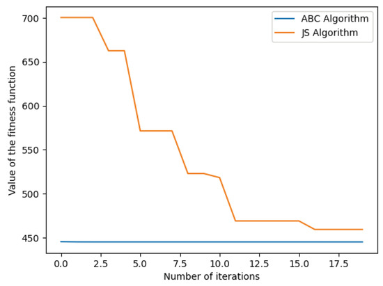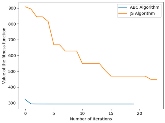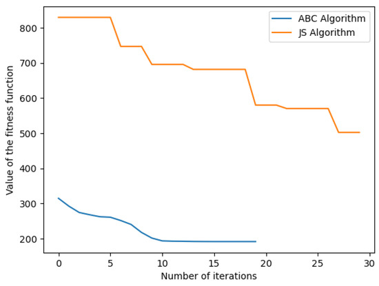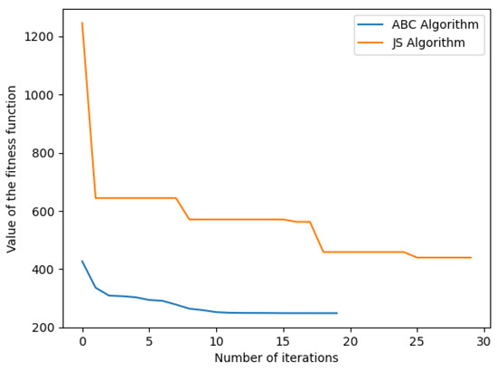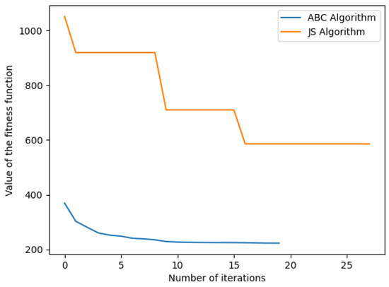 In this section, we conducted a series of tests. First, we compared the performance of two metaheuristic algorithms, namely the Artificial Bee Colony (ABC) optimization algorithm and the Jellyfish Search (JS) optimization algorithm. Next, a hybrid approach was tested by combining a metaheuristic algorithm with a deterministic one (Nelder–Mead or Hooke–Jeeves). The multi-agent metaheuristic algorithm served to perform a preliminary search of the solution space and locate an approximate area where the optimal solution may be found. In contrast, the deterministic algorithm was tasked with a more detailed search within this narrowed area. This approach allowed for the leveraging of the best features of both types of algorithms. This approach was intended to minimize the time required to find a solution while keeping the fitness function value at a similar level or even smaller.