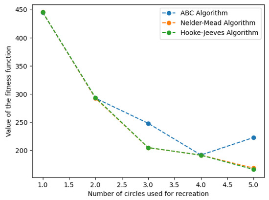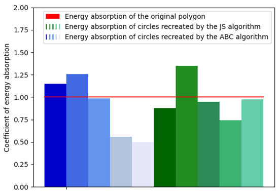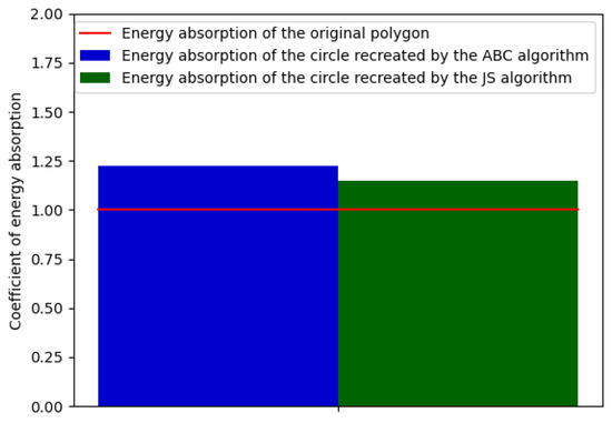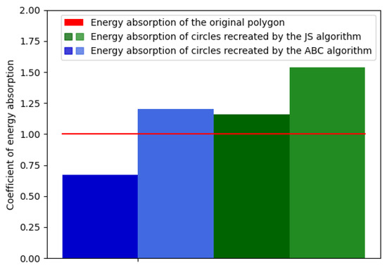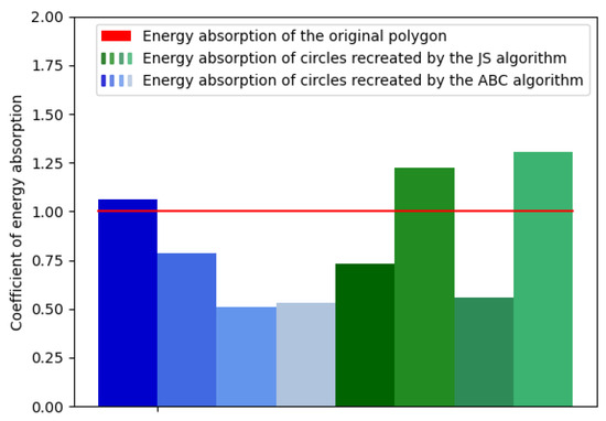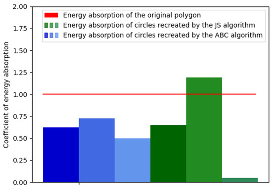 Example 1 aimed to compare and select the optimal metaheuristic optimization algorithm for further research. Based on experience, knowledge, and a review of the scientific literature, the optimization multi-agent algorithms chosen were ABC and JS. Therefore, we compared these two algorithms. In this comparison, the ABC algorithm performed significantly better and was subsequently used to create the hybrid algorithm (see Example Section 4.2). In each of the tests conducted, the value of the fitness function was significantly lower for ABC than for JS, as can be seen in Figure 6, Figure 9, Figure 12, Figure 15 and Figure 18. Figure 6, Figure 7 and Figure 8 present the results of identifying the polygon using a single circle. These figures compare the outcomes obtained from the two tested metaheuristic algorithms. Figure 6 shows the fitness function values over successive iterations for both algorithms. It is evident that ABC achieved significantly lower objective function values in every iteration. Figure 7 displays the result of identifying the polygon shape using a single circle. Using only one circle, of course, does not closely approximate the polygon’s shape; however, as shown in the figure, the circle covers a large portion of the original polygon. The circle was slightly better fitted in the case of ABC. The energy absorption level is shown in Figure 8. In this case, JS achieved a slightly better value, but overall (shape identification and energy absorption values), ABC produced better results. Figure 9, Figure 10, Figure 11, Figure 12, Figure 13, Figure 14, Figure 15, Figure 16, Figure 17, Figure 18, Figure 19 and Figure 20 show analogous results for the cases using two, three, four, and five circles, respectively. All the tests show that ABC far outperforms the JS. In particular, Figure 16 and Figure 19 illustrate this well, showing the recreation of the polygon shape using four and five circles, respectively. In the case of ABC, the circles cover the polygon relatively well, while for JS, the coverage does not look as good. It is also worth noticing that the time needed to perform the calculations grew according to the amount of circles used for the identification (ranging from around 22,000 ms with one circle to around 237,000 ms with five circles). Because of ABC’s overall better performance, it was used in the next series of tests using the hybrid approach.