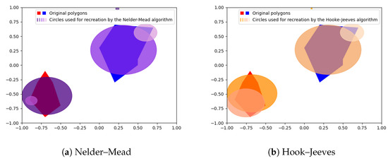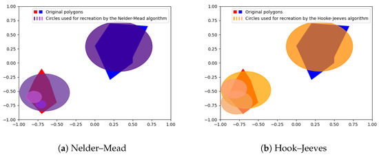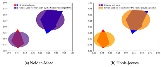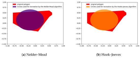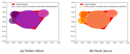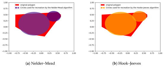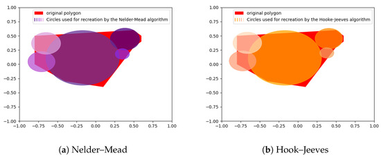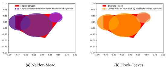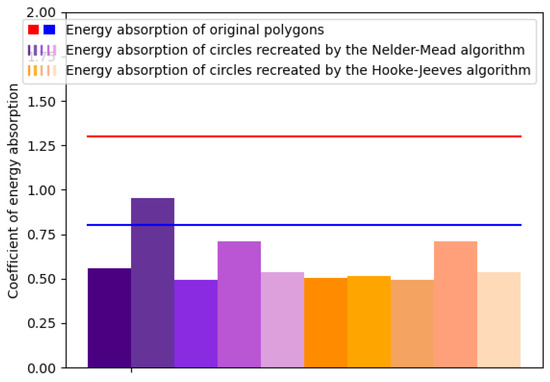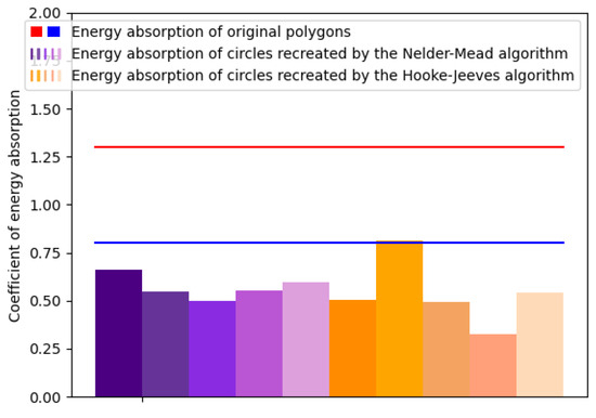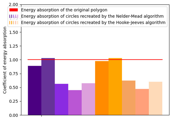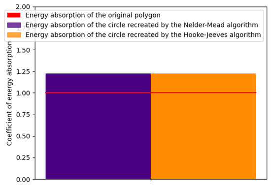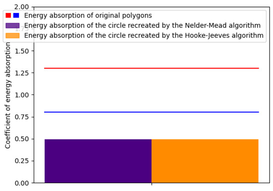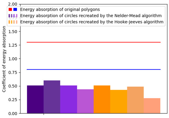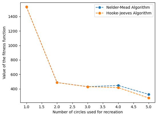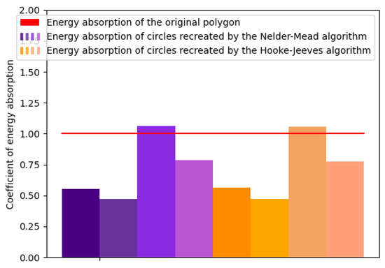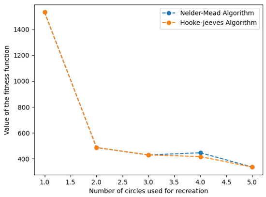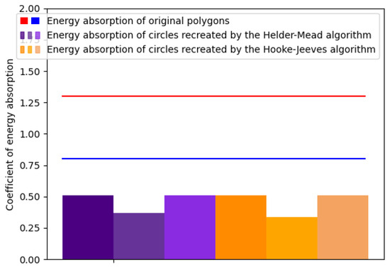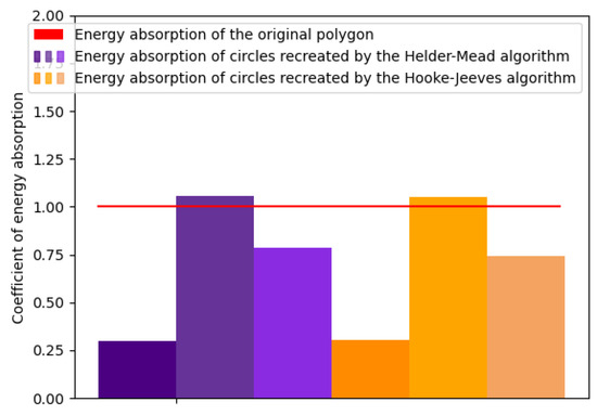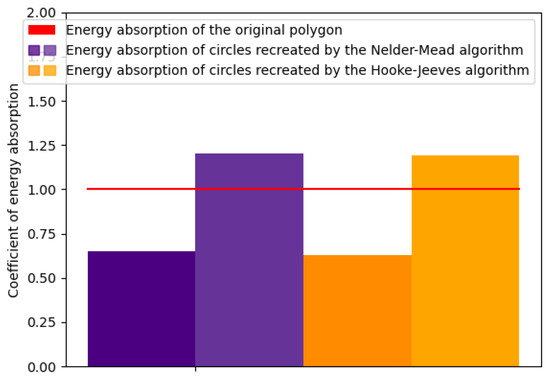 In Example 3, the number of polygons was increased to two, which complicates the problem (the search space dimension increases). The goal of this example was to further test the proposed hybrid algorithm. Similar to the examples in Section 4.1 and Section 4.2, the results obtained are presented in the form of Figure 34, Figure 35, Figure 36, Figure 37, Figure 38, Figure 39, Figure 40, Figure 41, Figure 42 and Figure 43. These figures show the fitting of circles to the polygon and the level of energy absorption. Notably, the overall performance of both algorithms was similar, with the Hooke–Jeeves performing slightly better. In particular, the cases using 1, 2, and 3 circles yielded very similar results for both the N-M and H-J methods. Greater differences in the results can be observed in the cases with 4 and 5 circles. For example, Figure 42 shows the arrangement of circles obtained with the two methods. In this case, the hybrid algorithm based on the Hook–Jeeves method proved to be better.