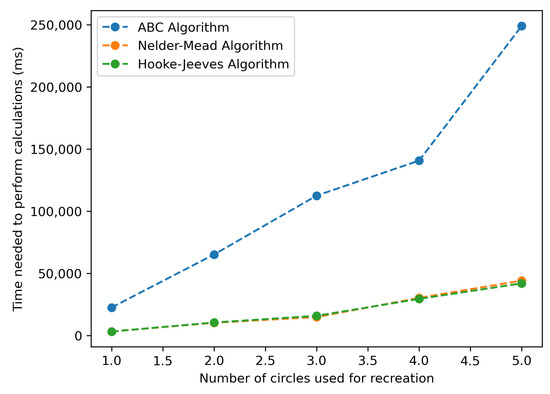 Table 1 presents the computation times (in ms) for the task of identifying a single polygon, depending on the number of circles. The obtained results show that the hybrid algorithms executed approximately six times faster than the algorithms based solely on metaheuristics.