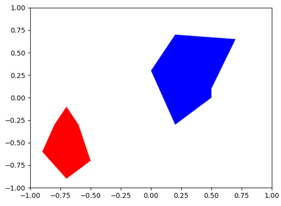 In this example, two different polygons are considered, which significantly increases the complexity of the task. A hybrid algorithm was used to solve the problem at hand. In the example under consideration, the Nelder–Mead and Hook–Jeeves algorithms were also compared. Additionally, the number of sensors was increased to 100. The shapes and arrangement of the polygons are shown in Figure 33. The energy absorption values are as follows: for the red polygon and for the blue one.