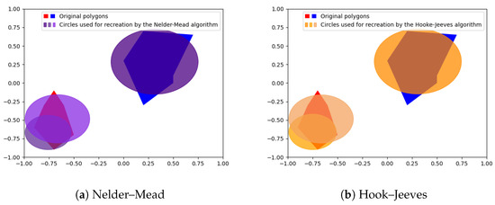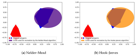 In the second example, we developed a hybrid algorithm based on ABC (metaheuristic multi-agent optimizer) and the Hooke–Jeeves (HJ) and Nelder–Mead (N-M) methods (deterministic methods). In this example, we compared both deterministic methods within the hybrid algorithm by testing their performance in the problem of localization for a single polygon. Both methods produced very similar results. However, the primary goal of this example was to compare the performance of the hybrid algorithm with that of the algorithm based solely on ABC (Example 1). It turned out that the hybrid algorithm performed significantly better in addressing the problem considered. This is confirmed by the calculation results. For example, Figure 31 presents the fitness function values obtained for the ABC and hybrid algorithms. In particular, for three and five circles, the hybrid algorithm returned significantly better results. A visual comparison of the figures related to shape identification using circles (between Examples 1 and 2) already suggests that the hybrid algorithm performed significantly better on the problem than the metaheuristic algorithm. This applies to both the hybrid with the Nelder–Mead and the Hook–Jeeves methods. For example, comparing Figure 19 (Example 1) and Figure 29 (Example 2) clearly shows that, in the case of the hybrid algorithm, the circles cover the identified shape much more effectively.