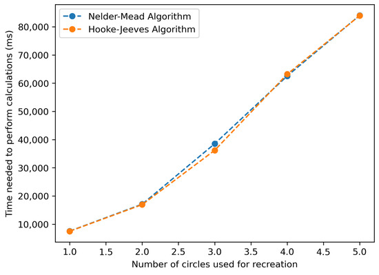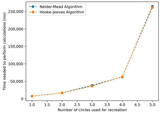 In Figure 44 and Figure 45, the fitness function values and computation times for both methods are compared based on the number of circles. Time needed for evaluation remained nearly identical for both algorithms, as well as the fitness function values. By comparing the graphs displaying the fitness function values for the examples in Section 4.2 and Section 4.3, it is noticeable that the curve of this graph differs between the scenarios. When identifying a single polygon, the fitness value decreases relatively steadily as the number of circles increases. Additionally, as more circles are used, the original polygon is covered with increasing accuracy. In contrast, with two polygons, the fitness value drops sharply when comparing one and two circles, with the value for two circles being roughly one-fifth that for one circle. However, after this point, the decrease slows significantly, becoming almost stagnant. This is also evident in the figures visualizing the test results—the accuracy of the identification does not noticeably improve with more than two circles, and the recreation with five circles even appears slightly less accurate.