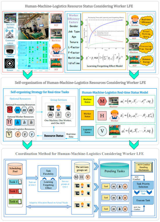 To address these issues, this paper proposes a real-time human–machine–material collaborative scheduling method considering workers’ learning and forgetting effects (HMLCS). The real-time scheduling method includes three main components: First, a mathematical model of learning and forgetting is used to calculate workers’ real-time efficiency, which updates the real-time state of manufacturing resources accordingly. Second, the real-time state of human–machine–material resources is modeled, and a method for grouping these resources is proposed. Finally, an adaptive scheduling algorithm that accounts for worker learning and forgetting is presented. The paper is structured into three main parts: (1) building a collaborative scheduling framework for smart workshops that considers worker learning and forgetting; (2) proposing a real-time scheduling method considering these effects; and (3) validating the proposed strategy through a case study of a coal machinery company’s workshop using a simulation platform built with Tecnomatix Plant Simulation software.