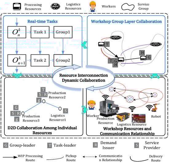 Real-Time Self-Organization of Human–Machine–Logistics Resources Based on D2D Interactions: The resource interaction mode in the intelligent workshop is shown in Figure 2, where tasks and represent two consecutive operations of task . The completion of each operation requires a service group composed of a production machine, a worker, and a logistics device to provide support. When facing the real-time task, the scheduling center can query the available production resource set and the available logistics resource set based on the task type. Machines initiate communication with logistics units via D2D technology and quickly form service groups based on real-time information and their respective service capabilities. Obtain the set of service groups that meet the service requirements of task . The most suitable service group is selected to execute task . Before the completion of task, the processing resource publishes the next task . The D2D-based human–machine–logistics self-organization mechanism includes four key elements: a service object, task publisher, production service provider, and logistics service provider. The service group formation process also includes two roles: Group Leader and Group Member. The Group-Leader is responsible for gathering Group Members, while Group Members provide feedback on task costs to the Group Leader. Production resources, typically fixed equipment connected to industrial buses, are less costly in terms of communication overhead. Therefore, the production resource in the service group for the current operation acts as the Group Leader and the task publisher for the next operation . After completing the collaborative task, the service group dissolves, and the resources are released for reallocation to new tasks.