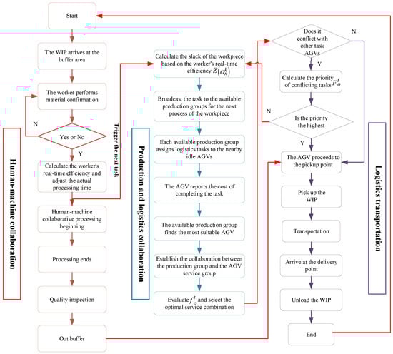 In summary, most current research on collaborative scheduling in workshops focuses on the coordination between human–machine or machine–logistics resources, while research on the collaborative scheduling of human–machine–logistics resources in smart workshops is still relatively limited. However, under the context of Industry 5.0, the coordinated scheduling of workers, intelligent logistics equipment, and processing equipment will become a critical aspect of workshop management. Therefore, this paper proposes a human–machine–logistics collaborative scheduling method for smart workshops that considers worker learning and forgetting effects (LFE). By leveraging the computational and communication capabilities of industrial internet of things (IIOT), radio frequency identification (RFID), and device-to-device (D2D) technologies, this method aims to achieve real-time collection of worker processing efficiency and other manufacturing resource data, enabling multi-resource real-time interaction. Consequently, task collaboration and allocation can be based on the real-time state of production and logistics resources, achieving high levels of human–machine–logistics synergy and production efficiency, ultimately enabling multi-objective dynamic optimization based on the real-time status of various resources.
