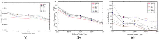 The results for three metrics of five worker types for Order 20: (a) completion time comparison chart; (b) energy consumption comparison chart; (c) delay time comparison chart.
