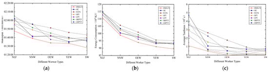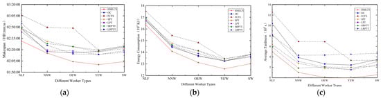 As order size increases, the scheduling performance of all workers improves, especially for experienced workers (e.g., OEW and SW). This suggests that as order size grows, workers become more adaptable to tasks, particularly experienced workers, whose learning and adaptation processes are more efficient. However, it is important to note that although larger order quantities lead to greater optimization effects, this improvement is limited. Each worker’s learning ability has an upper limit (parameter θ), beyond which further improvements in scheduling performance will plateau.