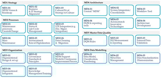 The data management maturity model (DMM) consists six functional domains (data management strategy, data quality, data operations, platform and architectures, data governance, and supporting processes) and was developed using the principles and structure of CMMI [6]. The maturity model was introduced in Pörtner et al. 2022 [9]. It provides an overview of the maturity level of data management in an organization [10,11] with a strong master-data focus. Twenty-six capabilities are defined under six process groups to provide maturity levels with a relevance evaluation for creating an extensive roadmap for continuous improvement in a structured and repeatable way. Master data in that context are a specific set of data that describes the key business entities on which an organization’s activities are based, such as business partners, products, or employees [12]. Moreover, objects of master data can be seen as official and basic business objects in companies that are used in value-adding processes [13].