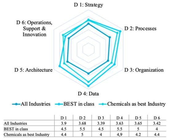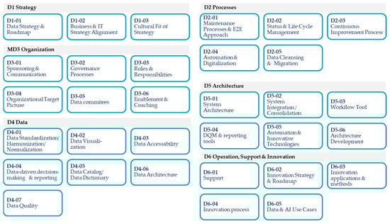 The organization dimension deals more specifically with the topic of governance and touches not only on processes but also explicitly on roles and responsibilities, data committees, and the general organizational vision. Employees and the topic of enablement and coaching are also addressed. While the CMMI model in the data dimension focuses very strongly on data quality, including the strategy, profiling, and cleansing of data, the proposed model addresses data visualization, data coherency, data accessibility, data storage in terms of data cataloging, and the data architecture picture. In addition, the handling of data is evaluated regarding data-driven decision making. The topic of data cleansing with associated migration is categorized in the processes dimension of the proposed model. The processes dimension covers data operations topics from the CMMI model when it comes to life cycle management and supplements this with process maintenance topics, continuous improvement process, and innovative topics such as automation and digitalization of processes. Both models are similar in the architecture dimension, with the difference that the proposed model also looks at automation and innovative technologies. In the support dimension, the CMMI model focuses on risk and configuration management and deals with topics such as measurement and analyses, process management, and process quality assurance. The proposed model focuses more on innovative solutions and includes capabilities such as innovation strategy and roadmap, innovation applications and methods, innovation process, and data and AI use cases.