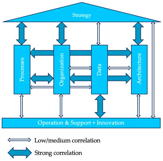 The technology portfolio of Industry 4.0 includes innovations such as the Internet of Things (IoT), cloud computing, artificial intelligence, and machine learning. In all of these technologies, data play an indispensable role. Data provide the essential foundation on which many organizations increasingly base their decisions and processes, bringing them closer to becoming data-driven organizations [1]. However, only one in four companies in Germany currently benefits from data [2]. Since 2022, the industry has progressed further and is now discussing “Industry 5.0”, where the focus is on “digitalization with a purpose”. According to Paul et al. [3], Industry 5.0 can be viewed as an extension of Industry 4.0, with a stronger emphasis on human–machine interaction and collaboration. Industry 5.0, therefore, not only takes a more customer-centric approach but also adopts a broader human-centered view [4]. Unlike Industry 4.0, which is technology-driven, Industry 5.0 is value-driven [5]. This shift underscores the need for organizations to harness the value of their data to remain competitive by focusing on relevant dimensions of the organization and its data. For digitalization to advance and for companies to extract value from data, organizations need a comprehensive digital strategy and roadmap to reach a mature level.