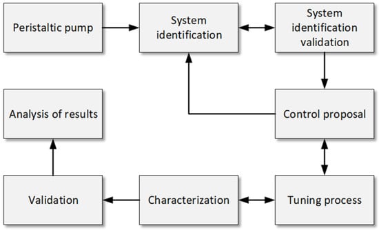 To address the objectives of this study, a comprehensive methodology was developed to identify, characterize, and control the peristaltic pump in a hemodialysis machine. The methodological process, as shown in Figure 1, highlights six stages: setting up communication between the pump, microcontroller, and LabVIEW; identifying the system; validating the transfer function; selecting the controller; and characterizing the system. These stages ensure the accuracy and repeatability of the pump’s performance under varying conditions.