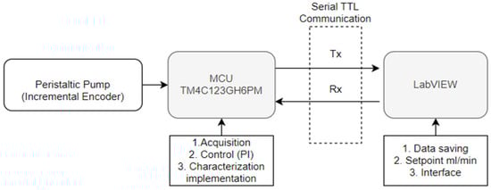 Figure 2 illustrates the automated control system for a peristaltic pump with an incremental encoder. The system consists of several interconnected components to enable data acquisition, control implementation, and user interaction. The TM4C123GH6PM microcontroller processes encoder data, regulates the pump’s PWM using a P.I. controller, and ensures proper system operation under varying conditions. Communication with LabVIEW is established through TTL serial transmission and reception (Tx/Rx) lines, with a 1 ms sampling time for rapid data updates and control adjustments. LabVIEW serves as the user interface, managing data storage, setpoint configuration in mL/min, and overall system interaction.