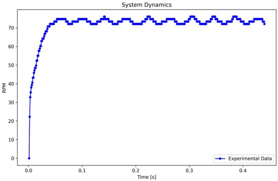 Subsequently, a step input of 24 V, equivalent to 100% of the input, is applied to the system. The RPM data are recorded at a rate of one sample per millisecond, resulting in the system response illustrated in Figure 3.