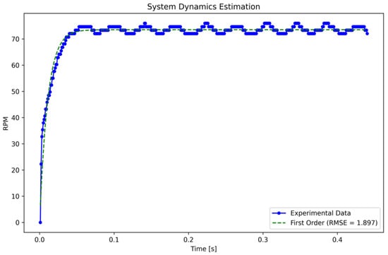 where represents observed RPM values at time , while denotes the predicted value as calculated by the model. The latter employs the parameters to describe the first-order transfer function. Finally, signifies the time at which each respective sample was taken. The fitting process is implemented using the Levenberg–Marquardt algorithm [17], which combines the Gauss-Newton and gradient descent methods to estimate the optimal parameters . Following the completion of the fitting process, the transfer function is expressed as illustrated in Equation (5):