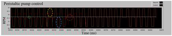 Figure 6 shows the steady-state behavior of the pump under P.I. control at a setpoint of 61.57 RPM. The system exhibits symmetrical deviations of approximately ±2 RPM due to the compression and release mechanism of the rollers. Positive deviations occur when a roller stops applying pressure to the hose (yellow dashed circle), while negative deviations are generated when the roller applies pressure to restart the process (blue dashed circle). These fluctuations are controlled by the system to maintain stability.