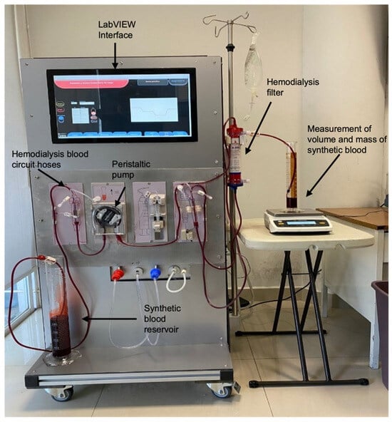 Experimental setup for system characterization and validation. Caption: The system consists of a peristaltic pump controlled by a LabVIEW interface, connected to hemodialysis blood circuit hoses, and a synthetic blood reservoir. Synthetic blood flows through a hemodialysis filter to simulate real treatment conditions. Volume and mass measurements are recorded using graduated cylinders and a Sartorius weight scale to validate flow accuracy and stability. The setup replicates clinical conditions by integrating all components required for precise flow control, enabling characterization and validation of the developed control system under realistic operational scenarios. Note: Red dye was added only to visualize the synthetic blood.