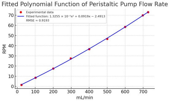 The relationship between RPM and flow rate (mL/min) was determined by averaging the ten replicates for each setpoint and plotting the results. Figure 8 illustrates the fitted polynomial function, which provided the best experimental fit with an RMSE of 0.9193 mL/min. This function was estimated using the non-linear least squares method, as detailed in Section 3.3 Validation. The polynomial model showed high accuracy in describing the relationship between RPM and flow, with minimal deviation between predicted and observed values.