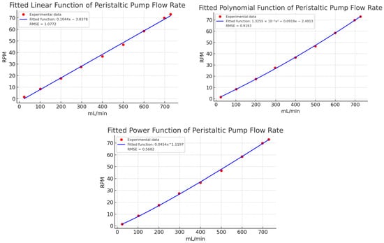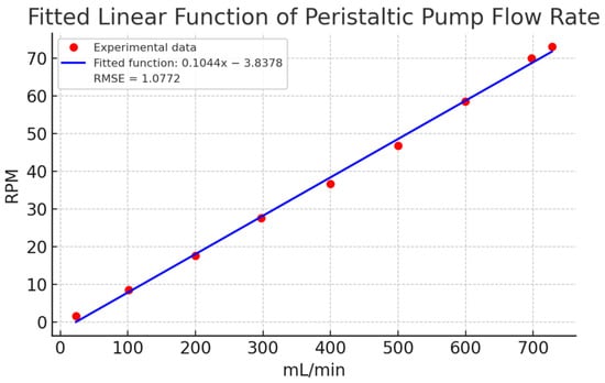 Finally, Figure 9 compares a linear estimation with the experimental data. The linear model showed deviations exceeding 15 mL/min in key points (e.g., 100, 400, 500, and 700 mL/min), confirming the need for a non-linear approach. The fitted polynomial function, with its small quadratic coefficient (1.3255 × 10−5), closely approximates a linear relationship but provides better accuracy. These results affirm that a non-linear model is more appropriate for describing the relationship between flow and RPM in peristaltic pumps.