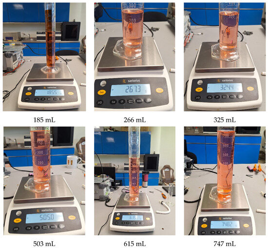 Flow rate calculations were derived by dividing the measured volume and mass by elapsed time. Measurement durations varied according to setpoint and cylinder capacity: 3 min for volumes of 20–300 mL, 2 min for 400–500 mL, and 1 min for 600–730 mL. To ensure accuracy and reliability, ten repetitions were conducted for each target flow rate. This methodology reduced variability, identified anomalies, and provided robust RMSE calculations, as shown in Table 2 [32,33].