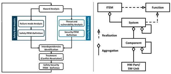 A possible approach to integrating the safety and security risk analysis [10] (left); the definition of the term ITEM in ISO 26262:2018 using SysML nomenclature [9] (right).