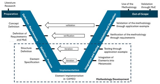 The development of the method is conducted by adapting the V-Model (Figure 2). Before the principal development, the concept of the method is outlined; this is accomplished by analyzing relevant stakeholders and their views. The views and the previously acquired general knowledge are the basis for the definition of the requirements and relevant measures of effectiveness. Based on the analysis of relevant standards, the structure of the method is defined, which is then broken down to its elements. The elements are then implemented in CAMEO using SysML and integrated according to the MagicGrid framework.