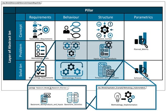 The modeling language used in this paper, SysML, is a graphical language. The information stored in the model is represented via a group of views or diagrams [26]. CAMEO SYSTEMS MODELER (CSM, Version: NoMagic 2022x Golden), the software in which the modeling is carried out, is a cross-platform, collaborative modeling tool from Dassault Systems that enables integration with a variety of other engineering tools from Dassault Systems. The metamodel of the method was created based on the CAMEO internal modeling framework MagicGrid. However, the framework must be adapted to the modeling of a methodology. This framework can be used for the entire SE lifecycle because the grid model is best suited for representing the various aspects and views of a methodology and because the master thesis is carried out in the native system of the MagicGrid methodology, in CAMEO [30].