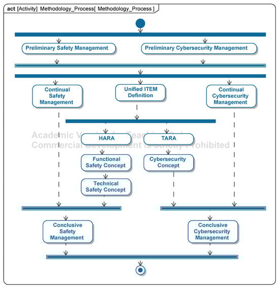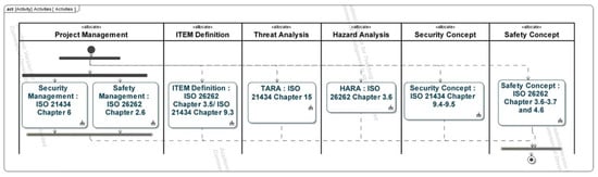 The analysis of the scientific literature shows that the implementation of the base standards in an MBSE context is widespread. The safety and security processes, conforming to the base standards, were carried out by Häring et al. [26]. The general focus of the scientific work in the subject area analyzed is on the implementation of the base standards or frameworks, such as TARA, as metamodels or templates for carrying out safety and security activities. Outside the focus of the publications is the integration of safety and security management into the method, the possible tailoring approaches depending on the use cases of the method, the detailed modeling of the individual activities from the perspective of method and information flow, and the modeling of the application environment of the method as a prerequisite for conformity with the base standards.