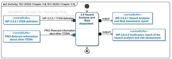 The ITEM definition consolidates all available information to ensure a shared understanding among stakeholders. It serves both safety and security frameworks, with ISO 26262:2018 [9] requiring a detailed description of the ITEM’s environment, functions, and impact on the vehicle. The analysis of ITEM boundaries and interfaces must document internal elements and shared interfaces with external ITEMs. Both black-box and grey-box models are required to specify interface types (e.g., mechanical, logical, electrical), varying by project. The ITEM architecture, modeled as a white-box view, describes its elements and interfaces. This may include decentralized or external elements for clarity. Functions are modeled as requirement sets detailing ideal behavior and limitations and as process models capturing activity sequences. Use cases define the ITEM’s purposes and interactions, further refined with additional requirements. The ITEM environment encompasses operational conditions, including climate, infrastructure, digital connectivity, and repair access. Lifecycle requirements address the ITEM’s needs across phases: development/testing, manufacturing, operation, service, and decommissioning. While focused on early phases, understanding later stages aids in tailoring safety and security requirements. The diagrams of the model are shown in Figure A6, Figure A7 and Figure A8.