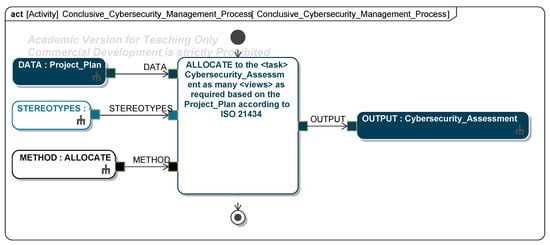 The procedure for implementing the method can be derived from the analysis of the base standards and the tailoring of the activities (Figure A1). Starting from the overview of the method (Figure 5), each chapter is further subdivided and specified in a diagram assigned to it until each activity of the method is modeled (Figure 6). An activity has three types of input information: DATA—information that is the basis for performing the procedure element; STEREOTYPES—the stereotypes used to model the outcome of the procedure; and METHOD—one of the methods specified in Table A1 that describes how the activity must be created. The method procedure refers to the initial processing of the activities; the iterative approach to processing has already been illustrated in the activity diagram, in which the method can only be completed by creating each defined work product.