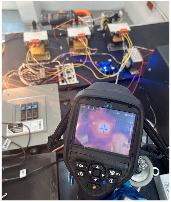 As a definitive complement in distinguishing between incipient short-circuit faults and load imbalances, infrared imaging is used to analyze the winding temperature under different operating conditions of the modified transformer. Figure 11 shows the reference frame of the infrared image for the transformer under analysis. In this image, the modified transformer is located at the center, with its secondary winding being the focus of the infrared analysis.