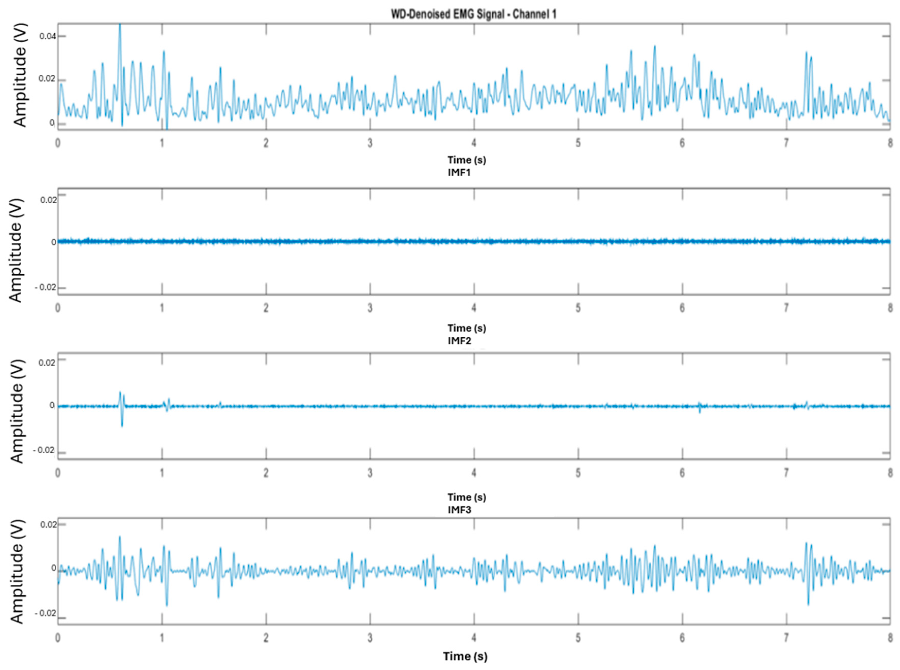 21] proposed a data acquisition system for measuring EMG signals for human lower limb activity recognition. Five leg activities have been accomplished to measure EMG signals from two lower limb muscles to validate the developed hardware. Five subjects were chosen to acquire EMG signals during these activities. The raw EMG signal was first denoised using a hybrid of Wavelet Decomposition with Ensemble Empirical Mode Decomposition (WD-EEMD) approach to classify the recorded EMG dataset. Then, eight time domain (TD) features were extracted using the overlapping windowing technique.
