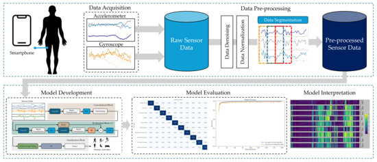 In the data acquisition phase, we collect sensor data from wearable devices, focusing on the UCI-HAR and WISDM datasets, which offer diverse real-world scenarios for activity recognition. During the data pre-processing process, we perform essential phases such as noise reduction, data normalization, and segmentation to prepare the raw sensor data for deep learning.