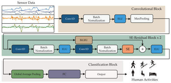 This section presents the ConvResBiGRU-SE model, an innovative deep-learning structure designed for efficient HAR utilizing data from wearable sensors. The model incorporates the benefits of CNNs, residual connections, BiGRUs, and SE mechanisms. This amalgamation ensures substantial feature acquisition and accurate behavior categorization. As shown in Figure 4, the architecture includes several essential components: a convolutional block for initial feature extraction, multiple SE-Residual blocks with bidirectional GRU units for hierarchical feature learning, and a classification module for final action recognition.