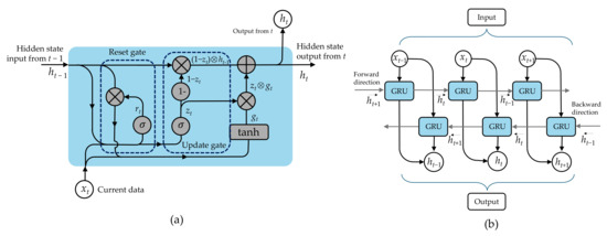 Structure of BiGRU: (a) GRU cell and (b) unroll BiGRU.