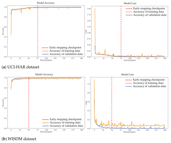 We identified the optimal hyperparameter settings that maximized the model’s accuracy through trial and error. The parameters consist of a batch size of 128, a learning rate of , and a maximum epoch limit of 200. An early stopping strategy was employed to prevent overfitting and ensure that the model learns generalizable patterns rather than merely memorizing the training data. The training was automatically halted after 10 consecutive epochs without any enhancement in validation accuracy. Furthermore, we instituted an adaptive learning rate strategy that decreases the learning rate by 25% if no enhancement is detected during the specified interval. This method facilitates more efficient model convergence and prevents entrapment in suboptimal solutions.