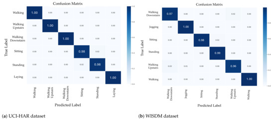 Let C represent a confusion matrix derived from the identical testing method. In these expressions, represent the k categories of activities in a HAR dataset, and denotes the overall amount of data elements classified within the matrix C. Diagonal elements represent concordant components that are accurately classified within the same category, whereas for denotes discordant components that are part of but are classified as . The confusion matrix C is depicted in Figure 7.