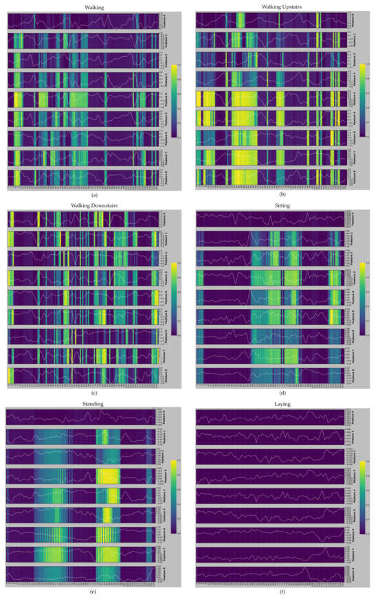 Visualization of the Grad-CAM method using UCI-HAR dataset: (a) Walking, (b) Walking upstairs, (c) Walking downstairs, (d) Sitting, (e) Standing, and (f) Laying. The white lines in the figures represent the original raw sensor signals from the accelerometer and gyroscope channels, allowing for direct visual comparison between the model’s activation patterns (shown by the colored heatmap regions) and the underlying sensor data.