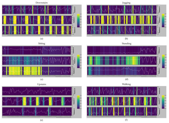 Visualization of the Grad-CAM method using WISDM dataset: (a) Downstairs, (b) Jogging, (c) Sitting, (d) Standing, (e) Upstairs, and (f) Walking. The white lines in the figures represent the original raw sensor signals from the accelerometer channels, allowing for direct visual comparison between the model’s activation patterns (shown by the colored heatmap regions) and the underlying sensor data.