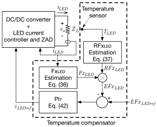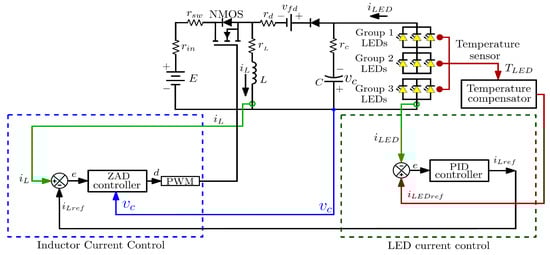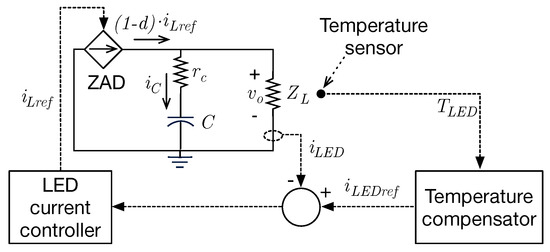 The correct operation of the ZAD controller makes possible to model the diode as a current source with a gain equal to . Based on this consideration, the equivalent circuit of the output node is reported in Figure 3. This figure also includes a cascade LED current controller, which automatically defines the reference value of the ZAD controller. Moreover, the figure considers the temperature compensator, which defines the LED current reference, thus ensuring a regulated luminous flux produced by each group of LED.