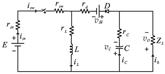 The electrical model of the power system, based on a buck-boost converter, is depicted in Figure 2. All parasitic losses are considered to ensure an accurate description of the system behavior. This circuit models the battery () and its internal resistance (), and also considers the conduction resistance () of the MOSFET channel N. In addition, the inductance (L) includes the parasitic resistance () and the capacitance (C) includes the corresponding parasitic resistance (). Furthermore, the diode (D) considers both the resistance () and the forward voltage (). Finally, the load is connected to the circuit and represented as ().