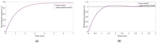 Concerning the parameters of the LED current controller, it is designed to achieve a settling time lower than 3 ms and a damping ratio , which provides a balance between the response time and the maximum overshoot. The first step is to verify the conditions specified in Equation (29) for the simplification of the transfer function : and , where krad/s is calculated from (32). Figure 4a shows the comparison between the exact output node model presented in Equation (28) and the approximation reported in Equation (29), where the correct behavior of the approximated model is evident, hence the control design equations are precise.